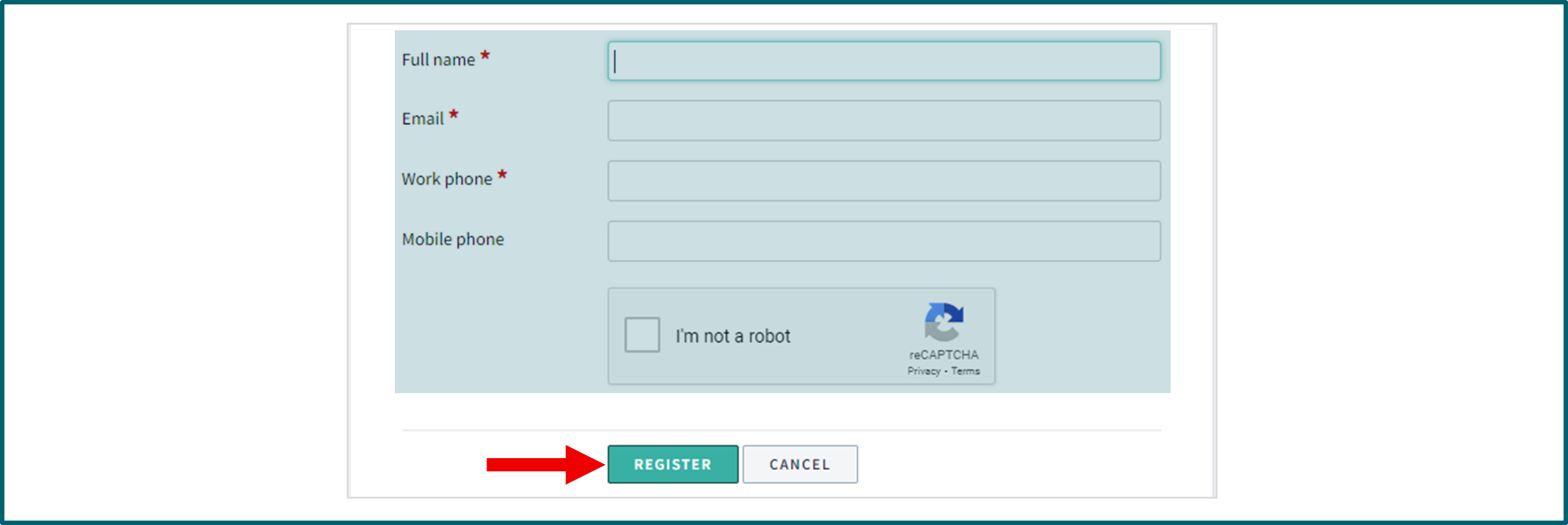4. Complete your account registration information (shaded) and click “REGISTER” (arrow). NOTE: For customer specific site access, be sure to use your company email address.